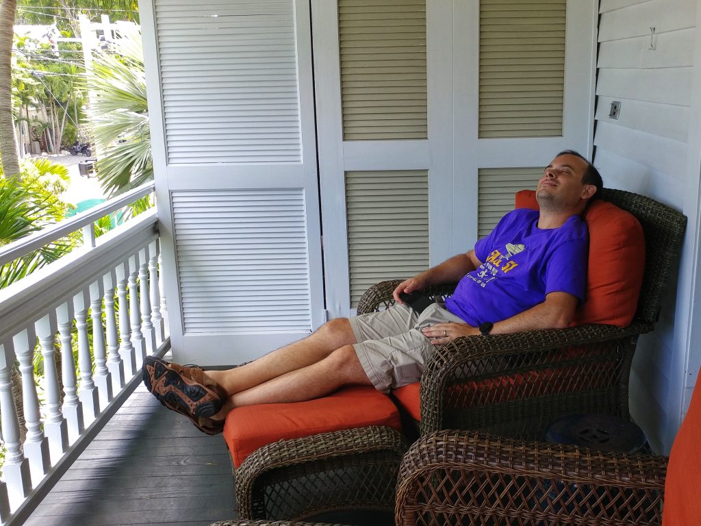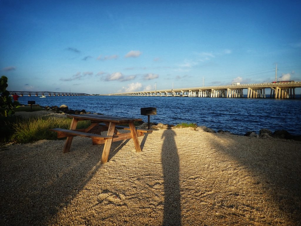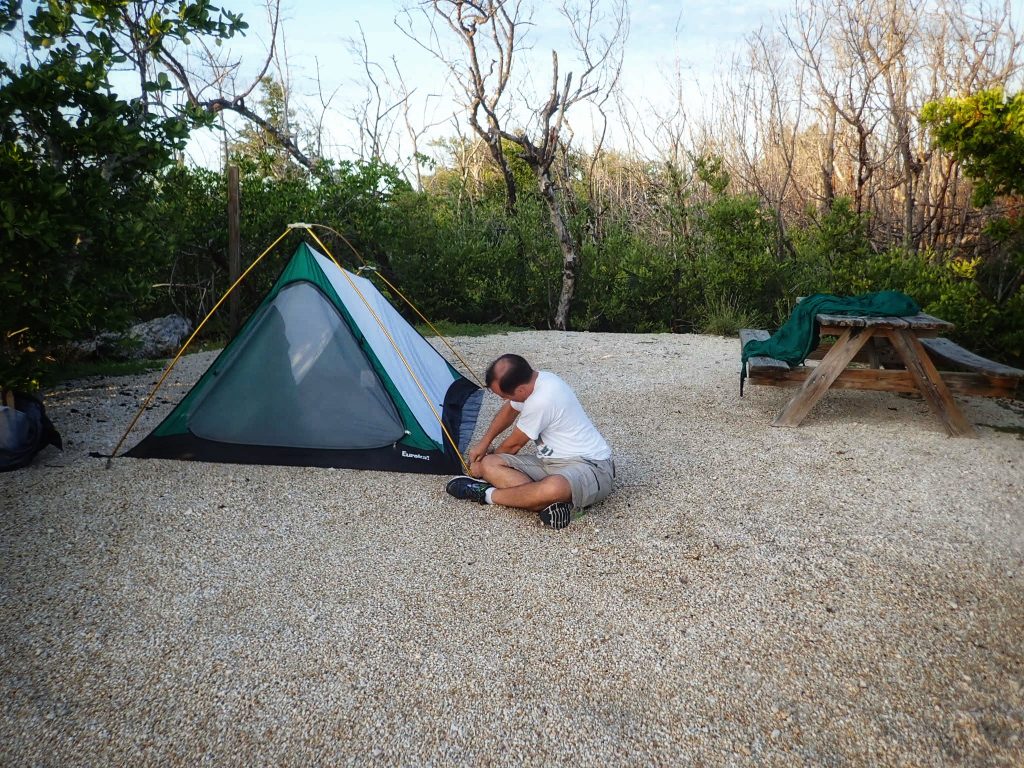 So, this time I planned things differently. In January, I booked a weekend campsite at Bahia Honda State Park in the Florida Keys for October. I thought it would be cooler and comfortable, in a beautiful area, and close to Key West so he wouldn’t get bored. I also planned to pack an inflatable mattress so that he would have a comfy bed to sleep on. In the week leading up to our camping trip, I tested blowing up the mattress using Jeff’s car and my electric plug adapter. Success! Then within hours, the mattress was half deflated – boo! Jeff said he would rather sleep on the ground than buy another mattress, so I planned to double up my bed rolls instead. We got everything packed and managed to leave in the evening on Thursday when it looked like nothing was imminently heading in through the ER. We spent the night in Homestead which is my favorite way to start out our Florida Keys weekends. We get to miss all of the Miami morning rush traffic this way, the hotel rooms are very inexpensive, and the location is close to things that I like to visit like the Biscayne and Everglades national parks. Even better, we can just wake up the next day and get to the next adventure instead of adding a couple of hours of driving first.