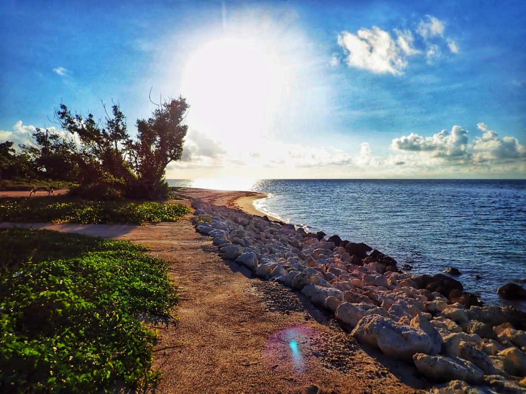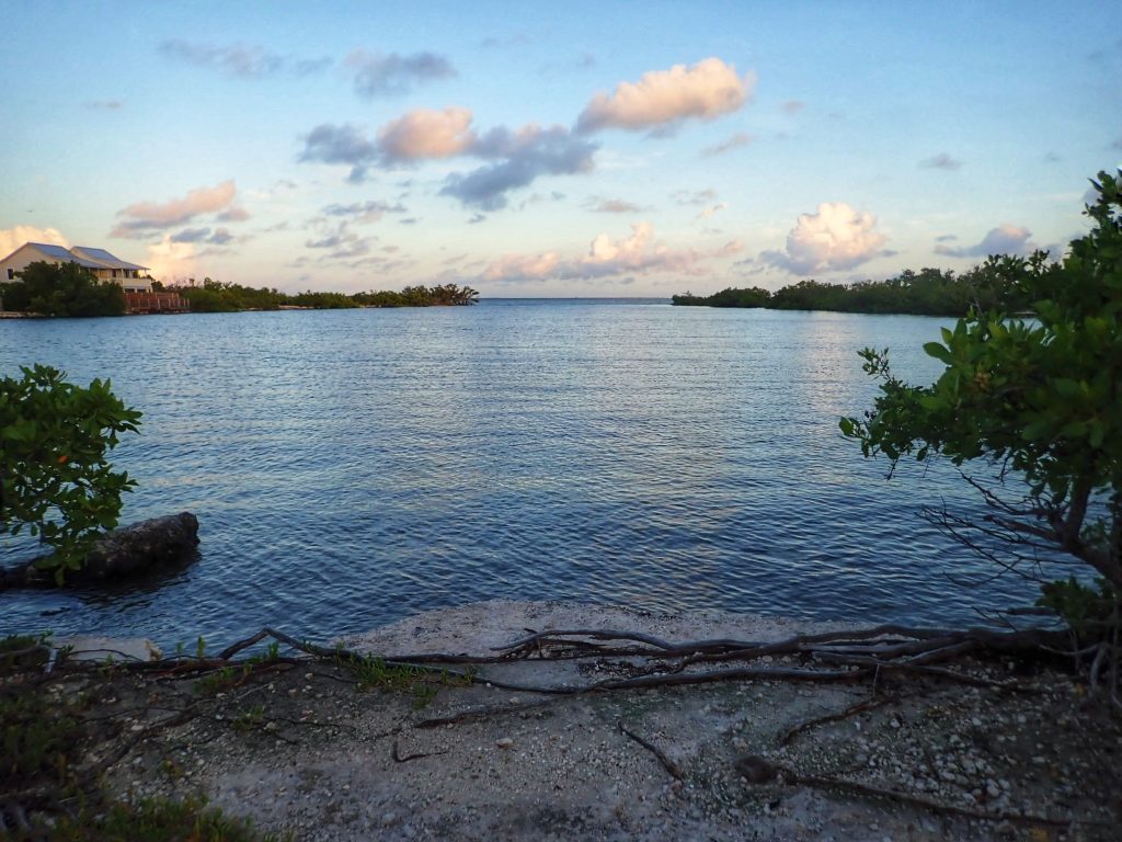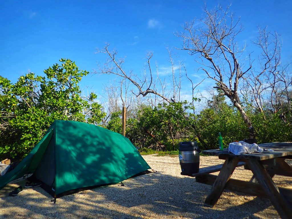 We headed out in time to get to Bahia Honda State Park before sunset. Check in was a breeze and our campsite was sooooo beautiful! We were in the Bayside campground that was just a few feet away from the lapping waves on one side and mangrove on the other side. If it was peak hurricane season I would feel claustrophobic, but the weather is calm and the water is smooth, so there we no worries about a flooded tent. Camp set up easily and we got everything laid out just in time for dark. There wasn’t a firepit, but we did have a camp grill to use instead. We had smoked turkey dogs, Hawaiian sweet crescent rolls cooked brown and smokey on the grill, creamy garlic pasta, and Iguana Bait beer. We also ate the guanabana for dessert – a weird but tasty fruit. I saved the seed to grow some guanabana trees.