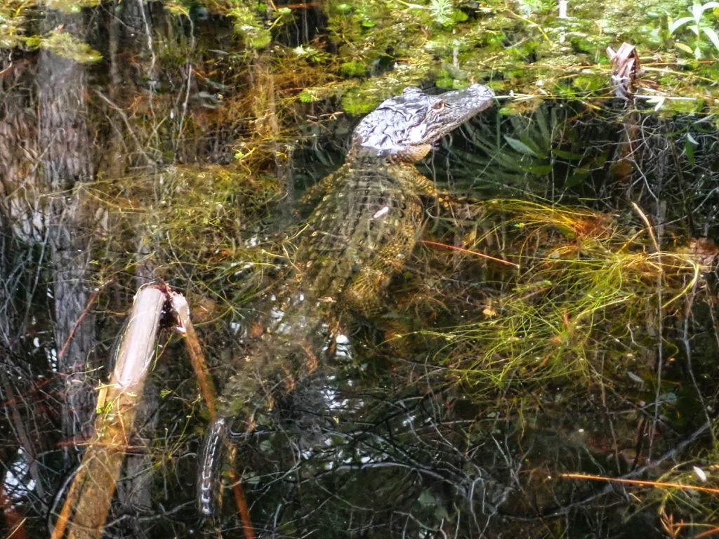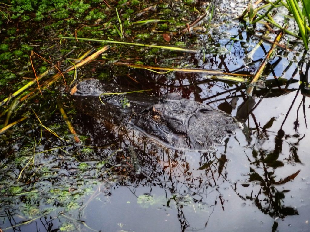 Deeper in the park, I saw a couple of gators. One was a small guy that I sometimes see in the water trickling under the culvert. The other was a larger baby (at least 6 feet long) just a couple of feet off the bike bath. I didn’t get too close and made sure I was ready to speed away if the turned around quickly.